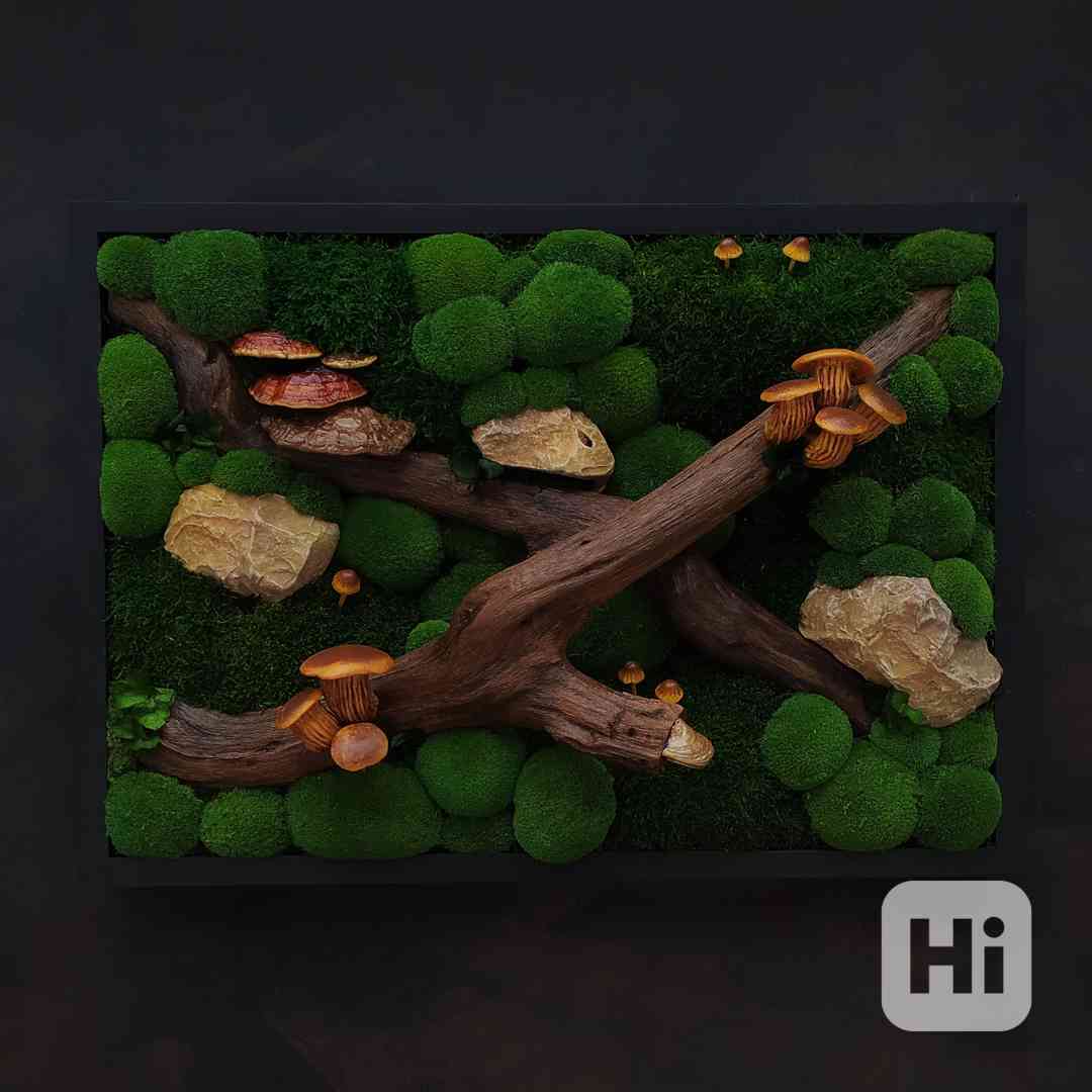 Obrazy jsou ručně vyrobené ze stabilizovaného mechu, rostlin a sušených hub tzn, že jsou bezúdržbové.