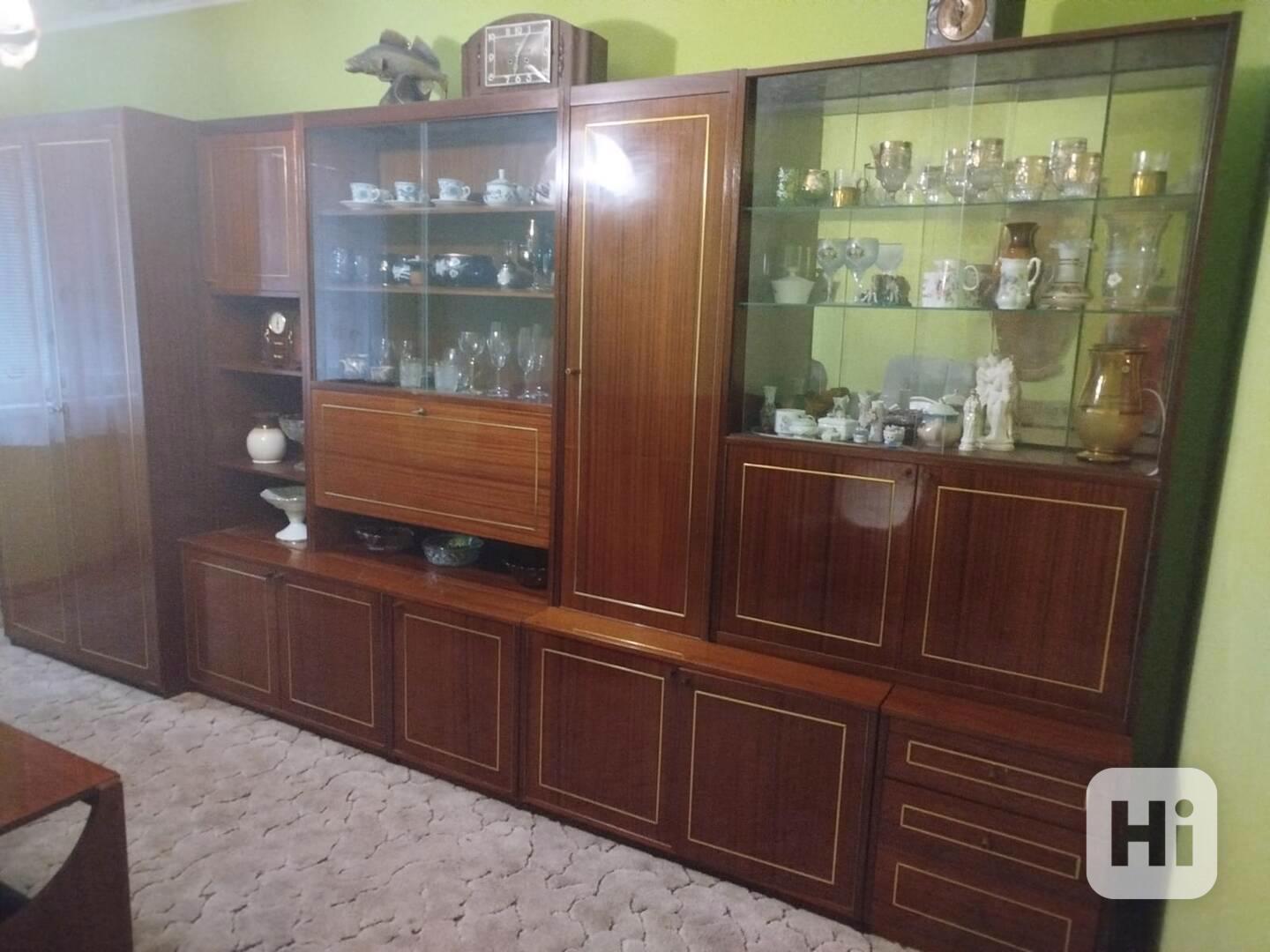 DARUJI ZA ODVOZ obývací stěnu retro, Chodov u Sokolova. Délka sestavy 4 m, výška 2 m. Šířka skříně 1 m, hloubka 60 cm. Hloubka vrchních dílů 35 cm, hloubka spodních skříněk 50 cm.