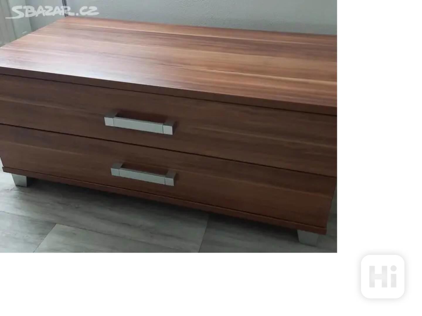 Komoda je zhotovena z laminované dřevotřísky. Rozměry: výška 45 cm, šířka 100 cm, hloubka 51 cm.