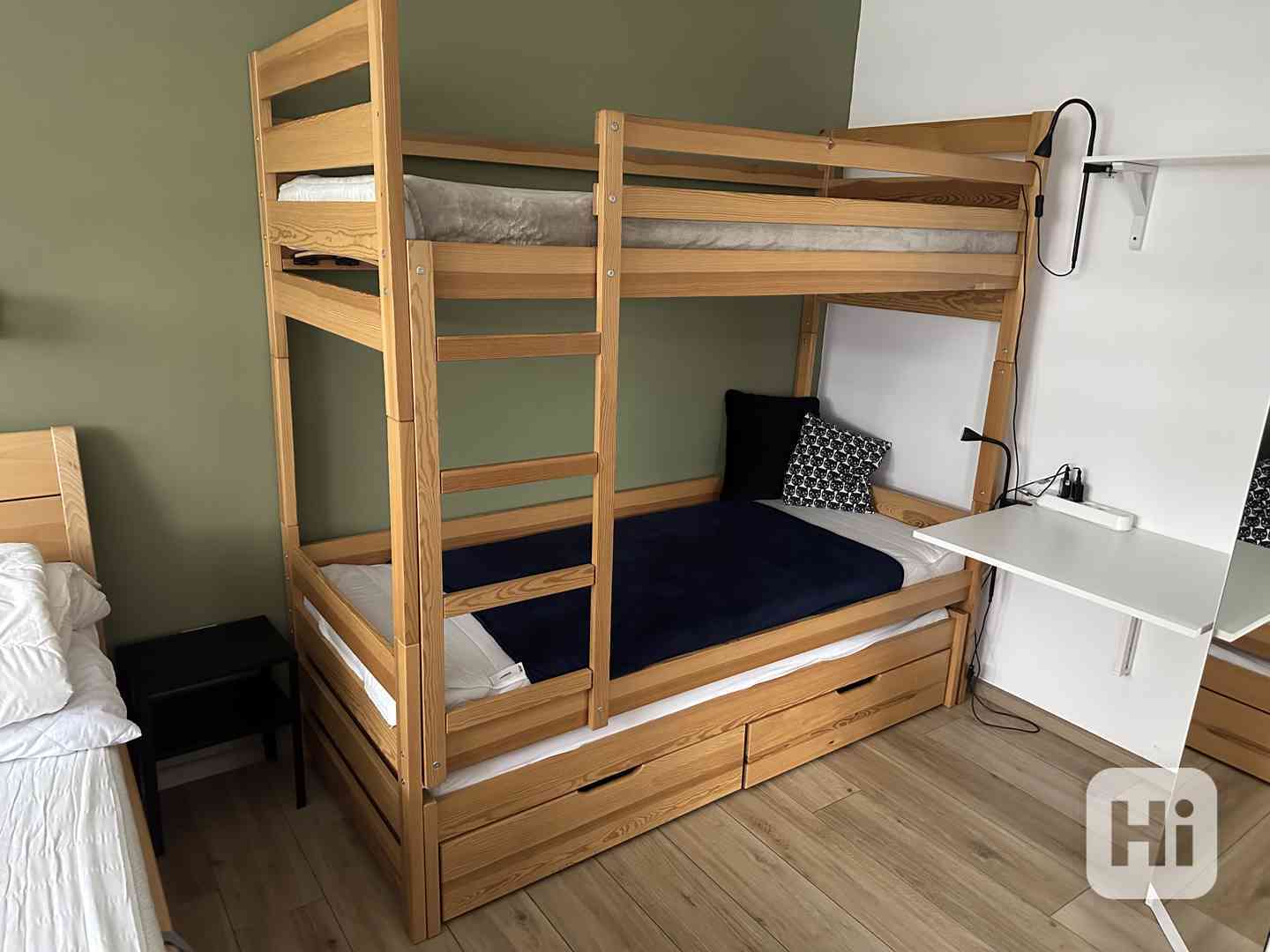 Patrová postel s vysouvacím lůžkem a dvěma úložnými šuplíky na kolečkách. Materiál masiv, borovice. Možnost upevnění žebříku na obě strany postele. Včetně matrací (2x 190x80x12 pro pevná lůžka, 1x 185x80x8 pro výsuvné lůžko). Minimálně používaná.