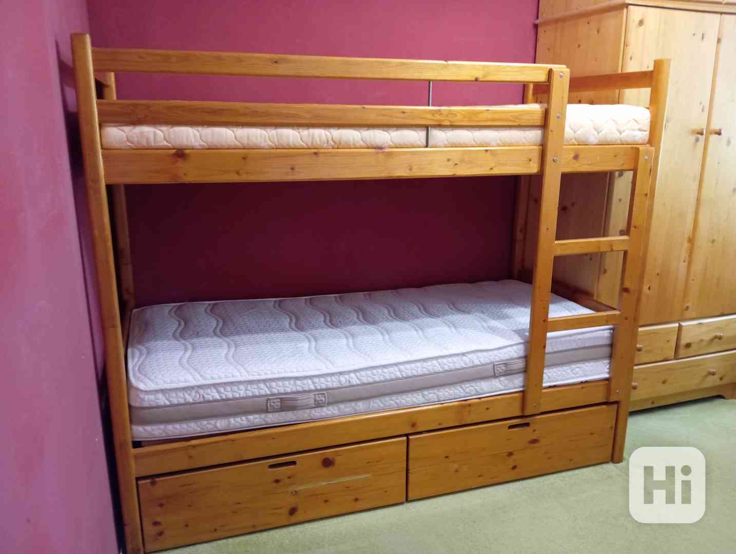 Prodám patrovou postel z masivního borového dřeva. Dá se rozložit na 2 samostatné postele. Včetně úložných šuplíků, roštu a matrací. Horní lůžko má děrovanou desku a pružinovou matraci, spodní lůžko má polohovatelný rošt a velice kvalitní matraci ze studené pěny.