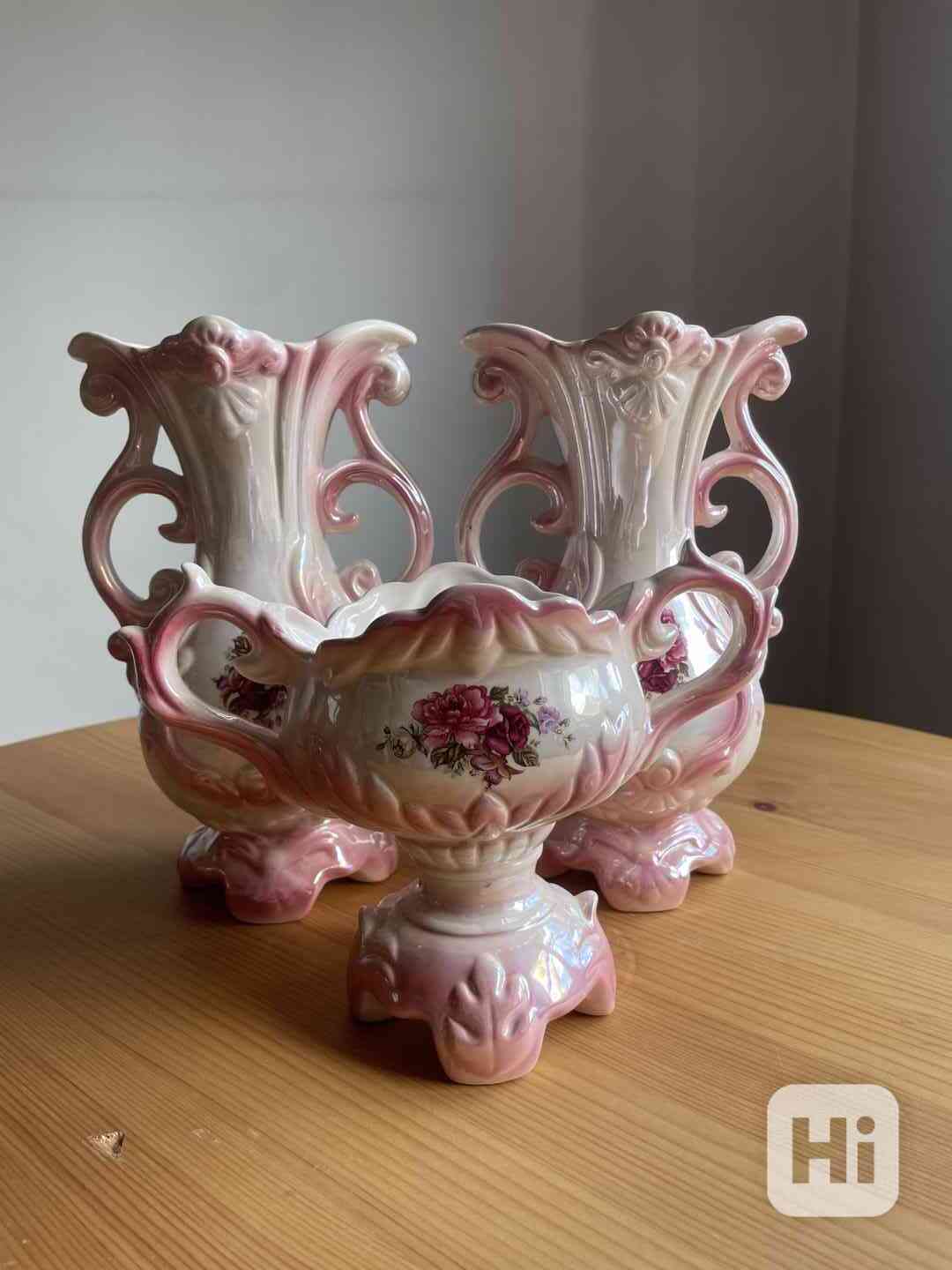 Prodám krásnou sadu 3 ks dekorativních váz (2x vyšší váza + 1x miska).Bohatě zdobené, jemné růžovo-krémové provedení s květinovým motivem.