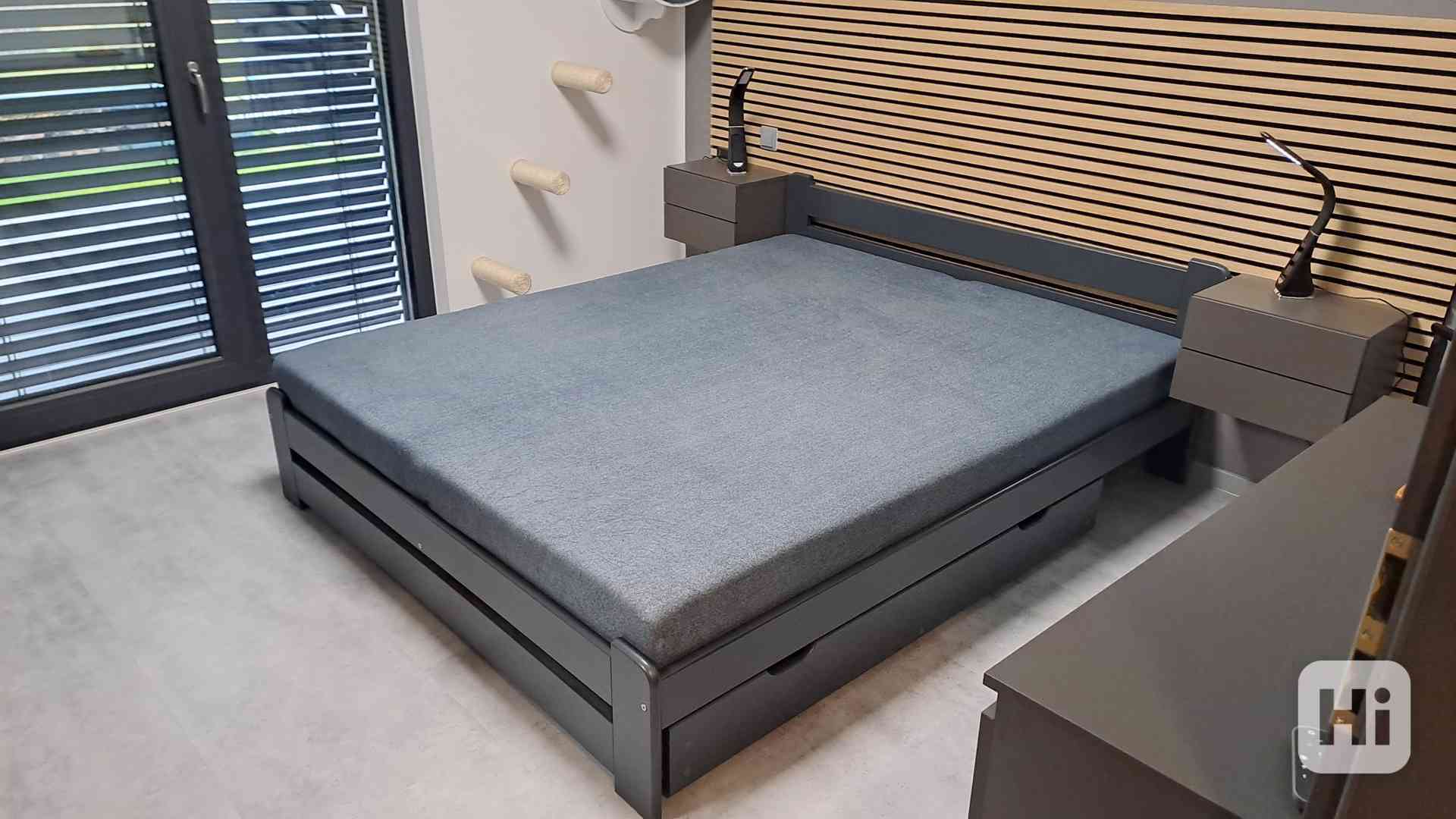 Prodám velmi zachovalou postel z masivu s lakem v odstínu antracit + laťový rošt z masivu + 2 šuplíky pod postel. Rozměry postele 205x168 cm, výška zadního čela 67, přední čelo 34 cm, středová stavitelná podpěra. Vhodná pro matrace 80x200 cm, nebo 160x200 cm. Laťový rošt ze 12 latí. 2 šuplíky (jeden v odstínu antracit, druhý světle šedý) rozměru 150x55 cm, výšky 18 cm s kolečky. Postel je téměř jako nová. V případě zájmu můžu nabídnout i 2 ks matrací 80x160, výšky 22 cm. Cena je za celý komplet – Postel + Rošt + 2 ks šuplíku (bez matrací).