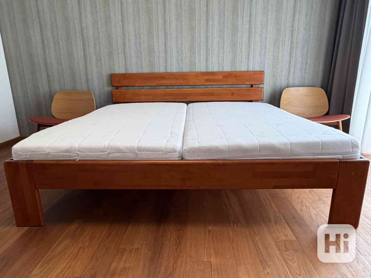 Dřevěná manželská postel s matracemi délka 200 cm/šířka 200 cm. Prodám kvalitní dřevěnou manželskou postel o rozměru 200 × 200 cm v nadčasovém designu. Postel je vyrobena z masivního dřeva s krásnou přírodní kresbou, která dodává ložnici teplý a elegantní vzhled.