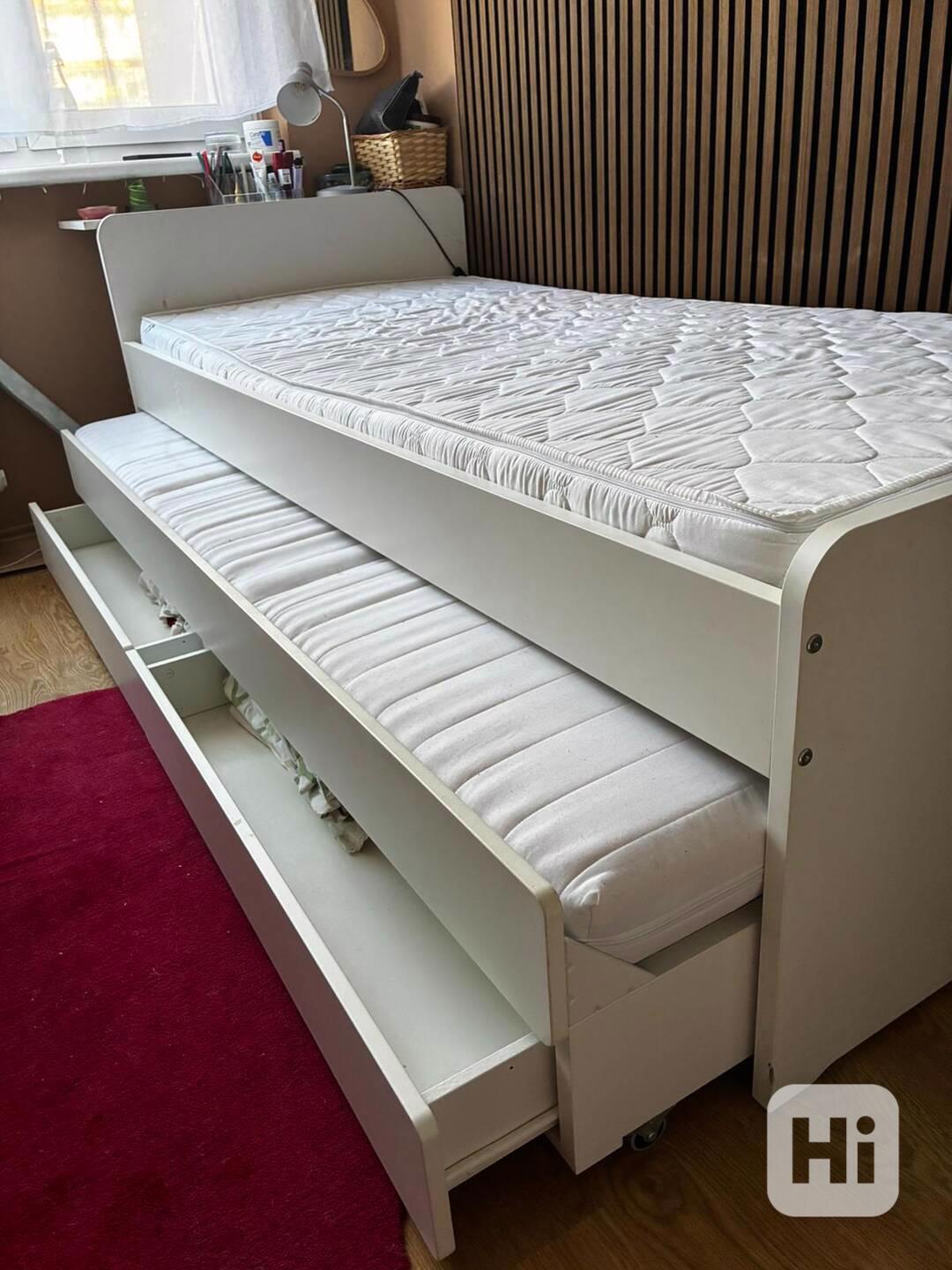 Prodám postel rozkládací s úložným prostorem, bílá,Zn.Ikea, v hezkém stavu,cena včetně matrací a obou roštů. 90x200 když je složená.