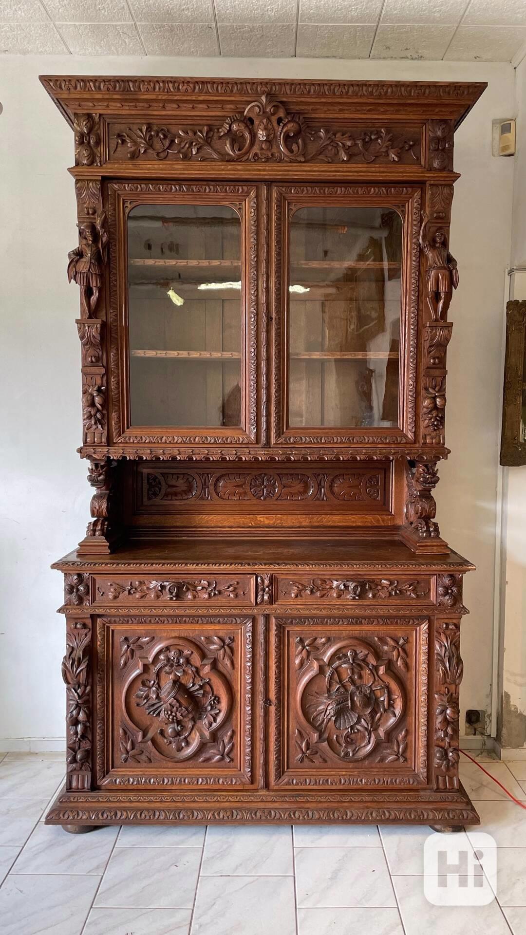 Starožitný lovecký příborník ● nádherný novorenesanční kousek ● lovecký motiv ● spousta přírodních motivů ● nádherně vyřezávan po celé ploše ● masivní dubové dřevo ● mosazné kování ● libovolně nastavitelné police ● atypický rozměr ● dvou dílný ● období historimus ● původ Francie ● 1880 - 1910