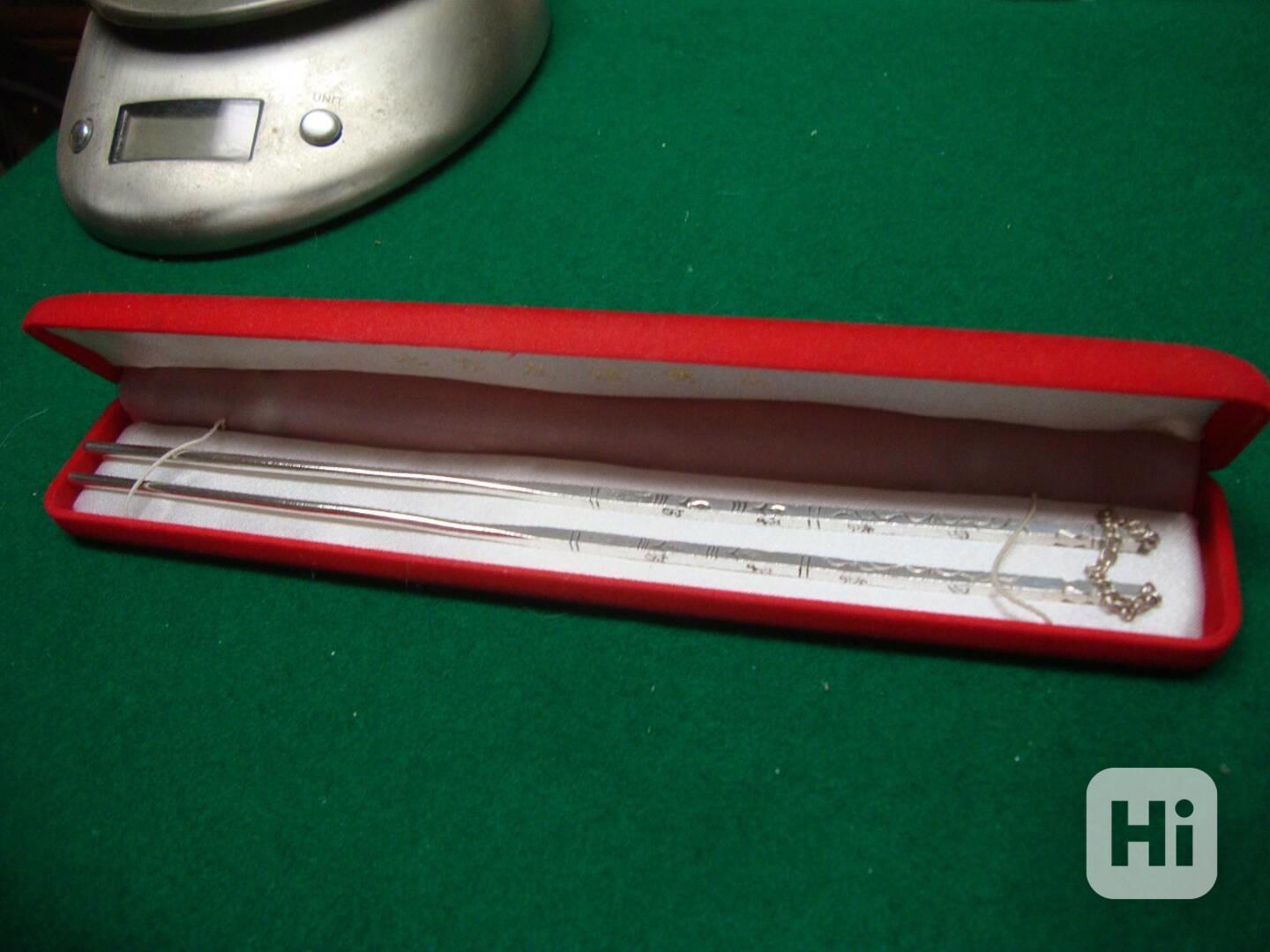 Prodám tyto stříbrné jídelní hůlky i s originální krabičkou. V pěkném stavu viz foto, řetízek drží, hůlky značené Silver. Hůlky váží celkem 39g. Krásné jako mimořádný dárek.