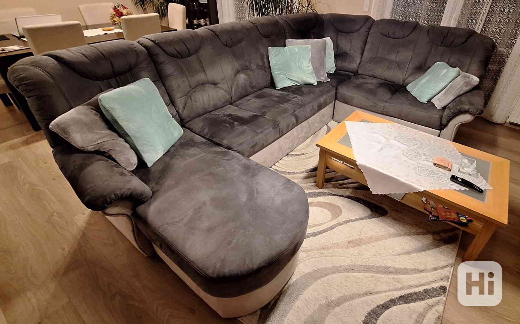 Nabízím sedací soupravu do "U", rozkládací s lůžkem a úložným prostorem. Má opotřebený potah. Na kratší části je poškozený sedák.