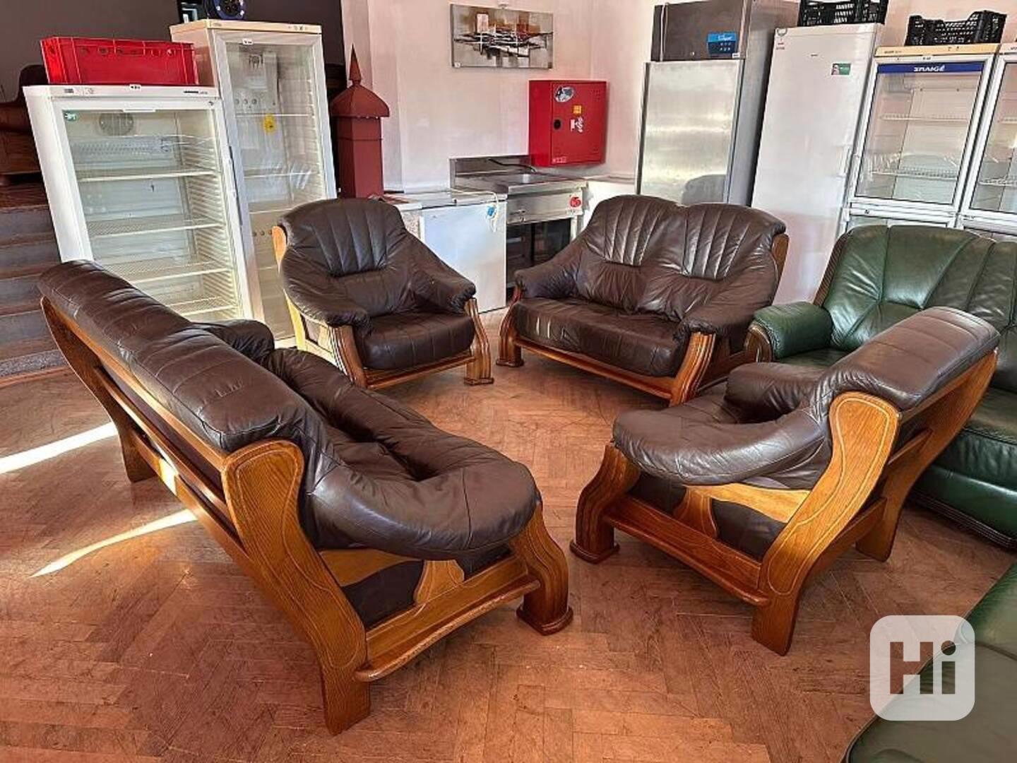 Pravá kůže v kombinaci s ozdobným frézovaným dřevem - tvrdé dřevo - masiv. Vhodná i k umístění do prostoru - vzadu dřevo, kůže, látka. Snadná manipulace – sedací části lze vyjmout. Vysoká sedačka. Pravá kůže. Barva tmavě hnědá.