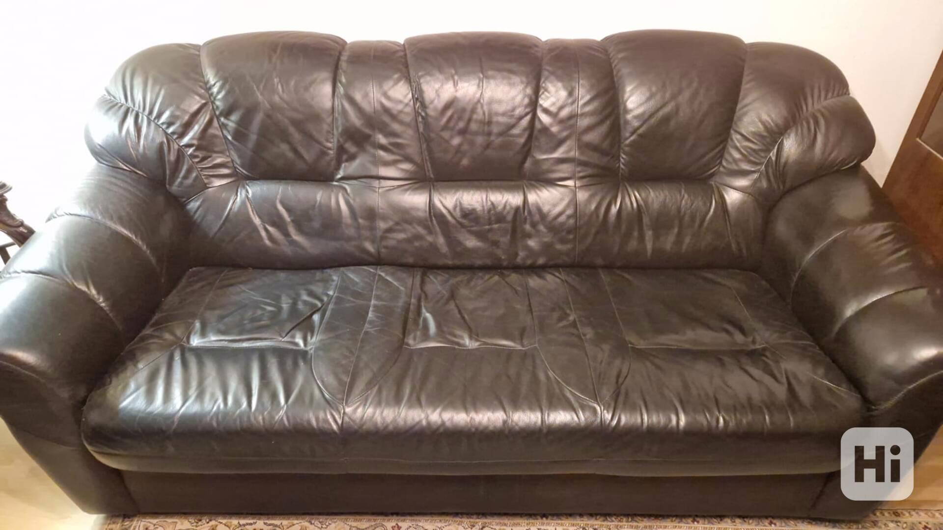 Sedací souprava pravá kůže, černá třídílná v bezvadném stavu. Sedačka třímístná a dvě křesla. Rozměr trojsedáku 195x87x85cm a křesla 2ks 100x85x90cm.