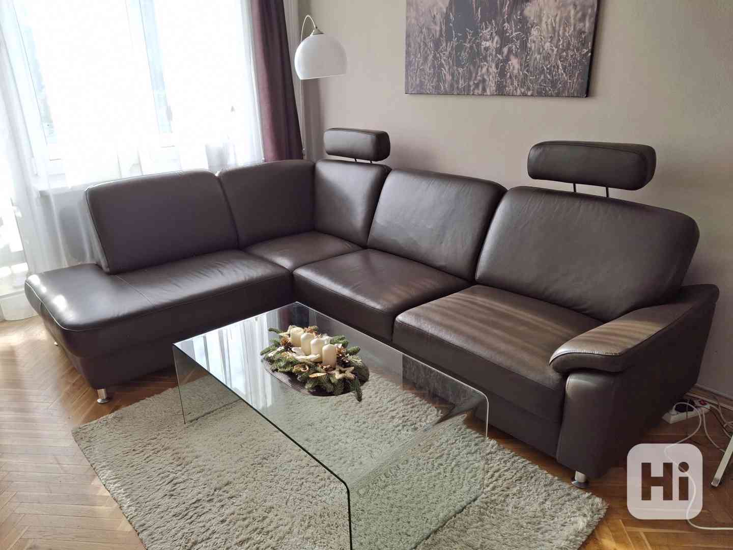 Prodám koženou sedací soupravu, tmavě hnědá, rozměry 200 x 263 cm, výška sedu 40 cm, 2 nastavitelné a odnímatelné hlavové opěrky, nohy chrom. U kratšího dílu sedací soupavy je i zadní část potažena kůží pro možnost umístění do prostoru. Výroba SRN.