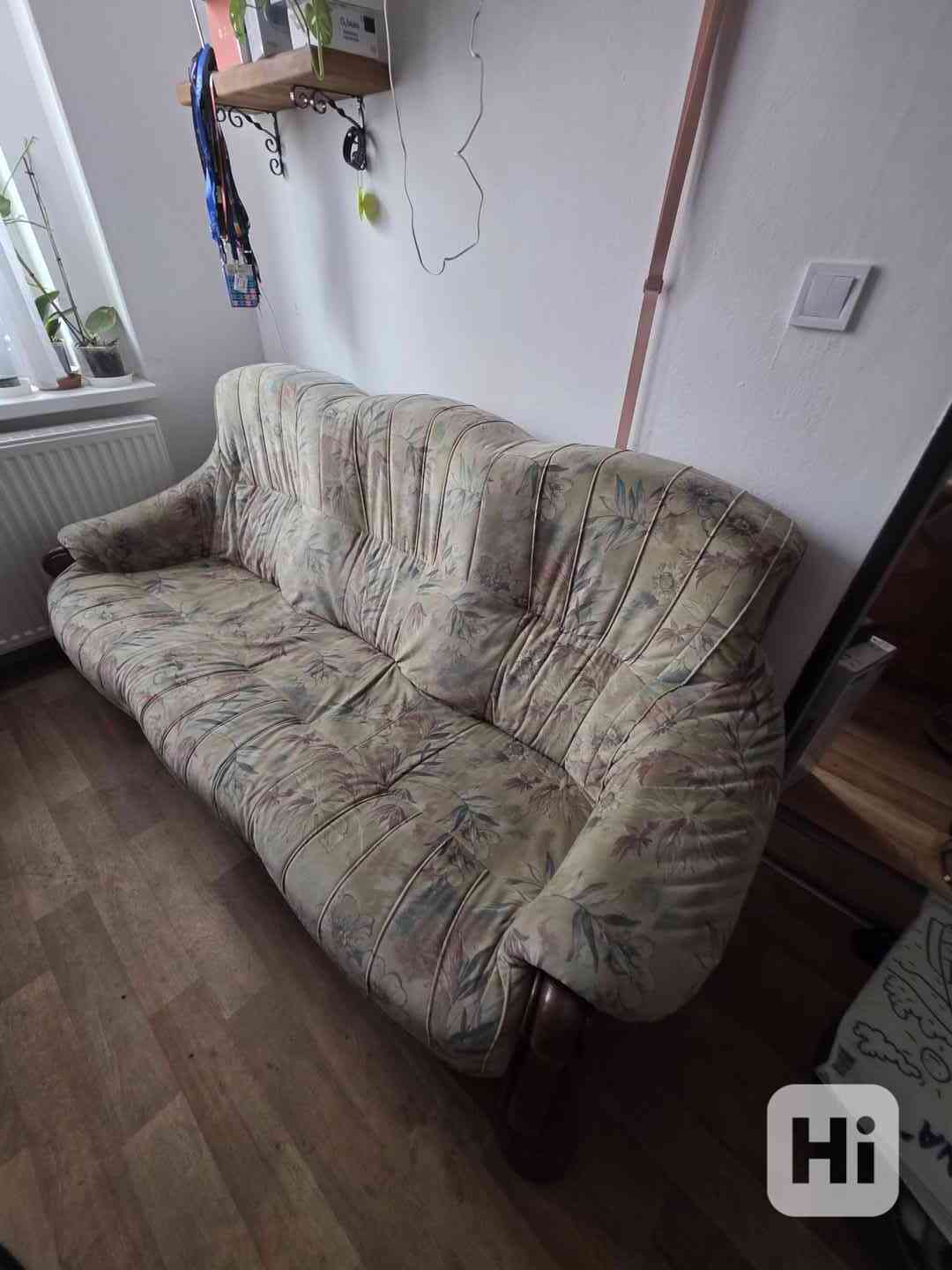 Sedací souprava (3+1+1): Prostorná třímístná pohovka a dvě mohutná, extrémně pohodlná křesla. Masivní dubová konstrukce s dekorativním vyřezáváním a kvalitním čalouněním s květinovým vzorem.