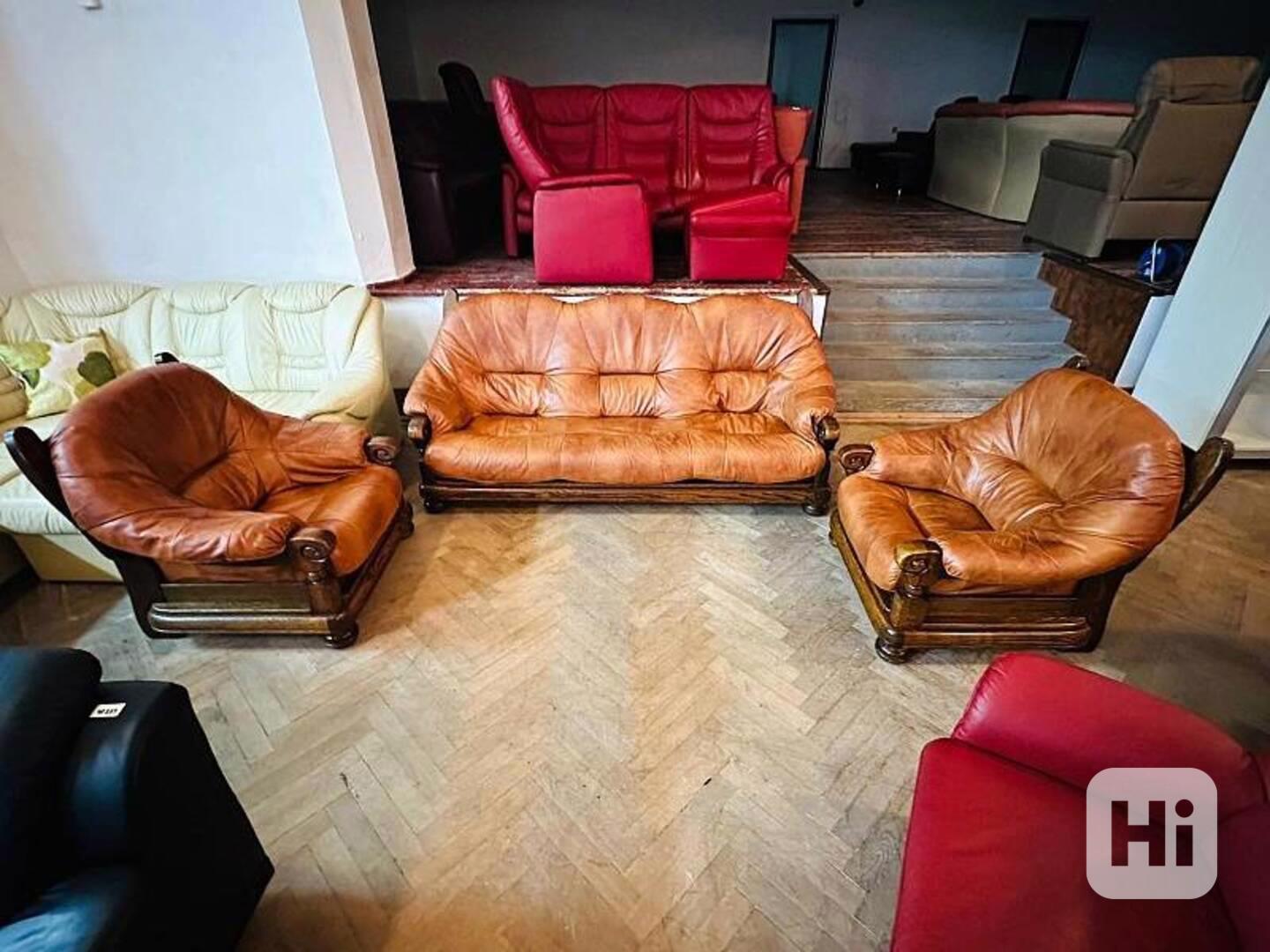 Pravá kůže v kombinaci s ozdobným frézovaným dřevem - tvrdé dřevo - masiv. Vhodná i k umístění do prostoru - vzadu zadní deska v barvě dřeva. Vysoká sedačka. Pravá kůže. Barva světle hnědá.