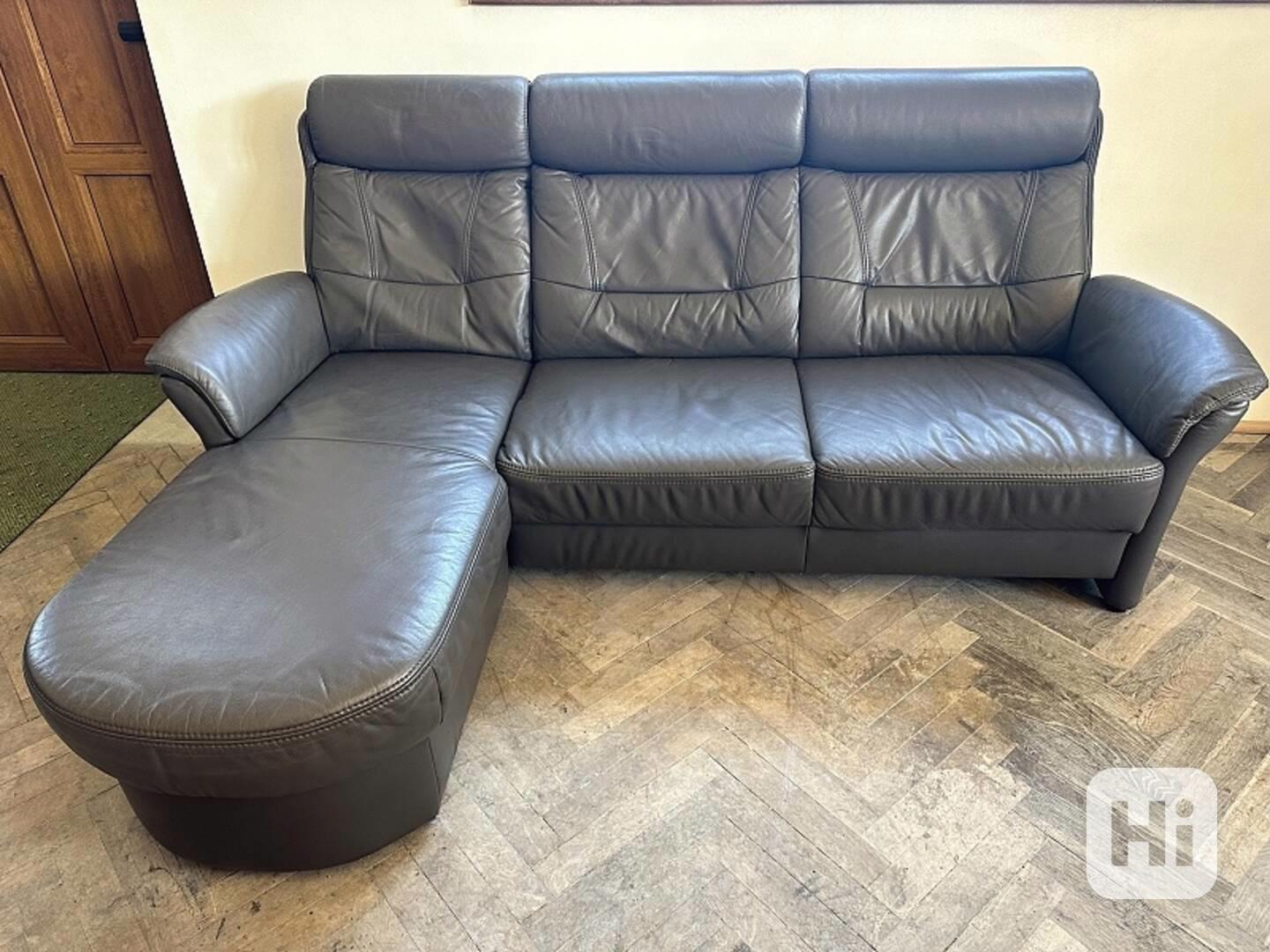 Vysoká sedačka. Za hlavami 3 stavitelné opěrky hlavy. Barva tmavě hnědá. Pravá kůže.