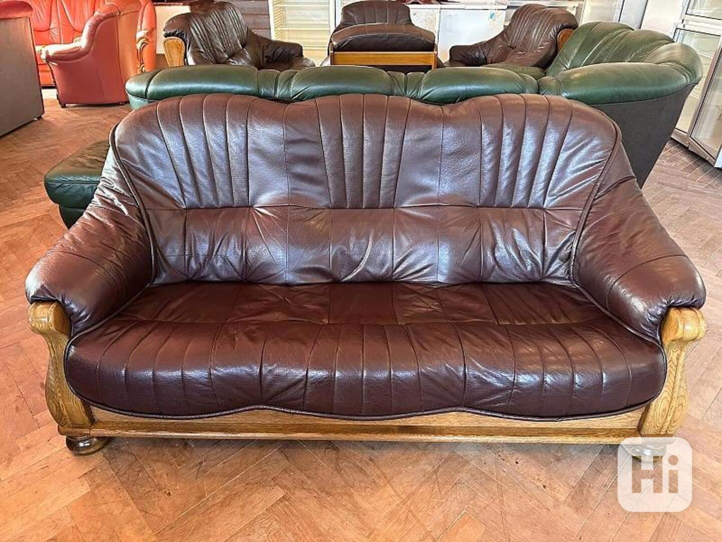 Velmi pohodlný kožený trojsedák v kombinaci s tvrdým dřevem (masiv), vhodný k umístění do prostoru - vzadu deska v barvě dřeva. Snadná manipulace – sedací část lze vyjmout. Barva tmavě hnědá. Pravá kůže.