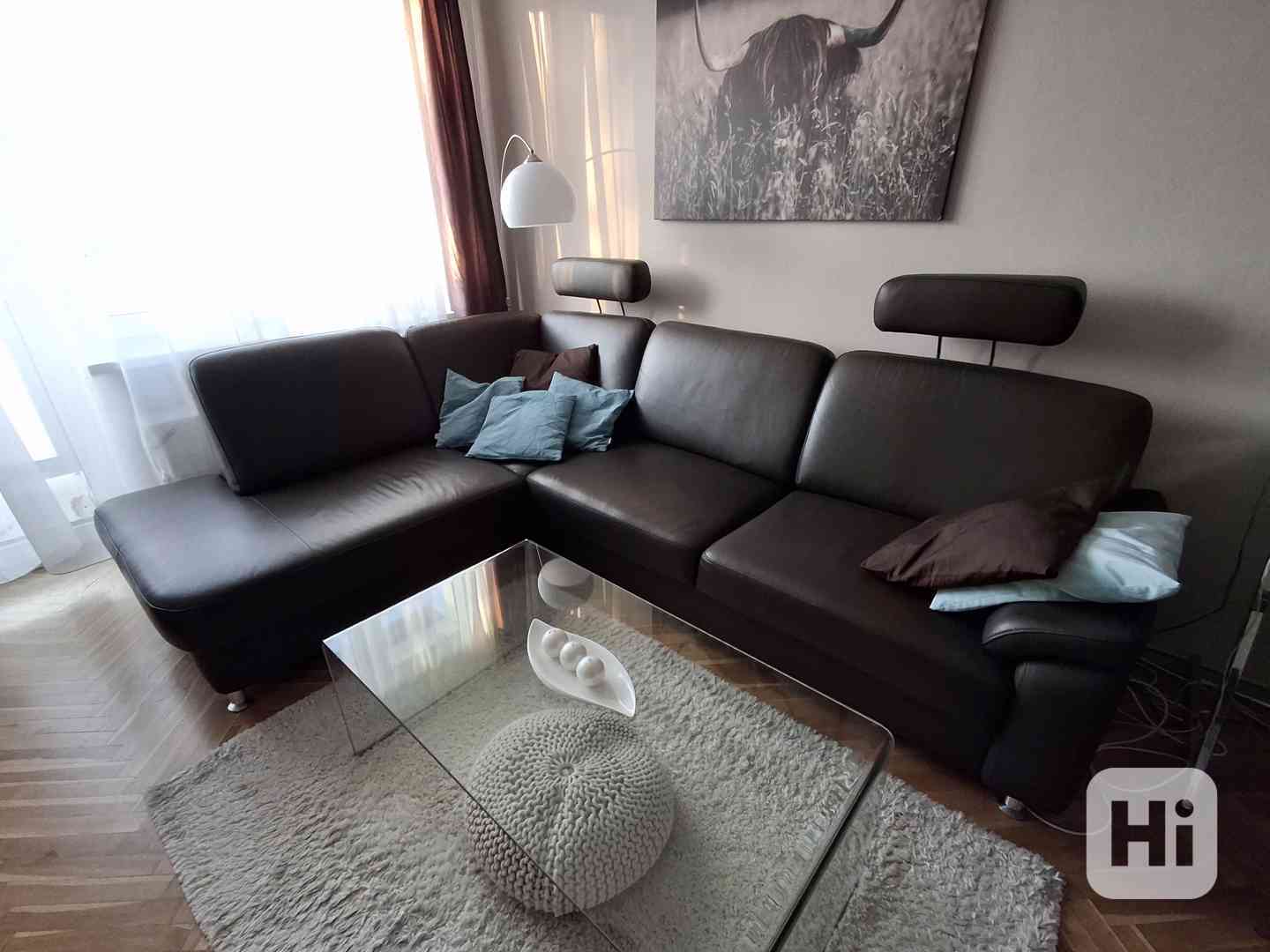 Prodám koženou sedací soupravu, tmavě hnědá, rozměry 200 x 263 cm, výška sedu 40 cm, 2 nastavitelné a odnímatelné hlavové opěrky, nohy chrom. Výroba SRN.