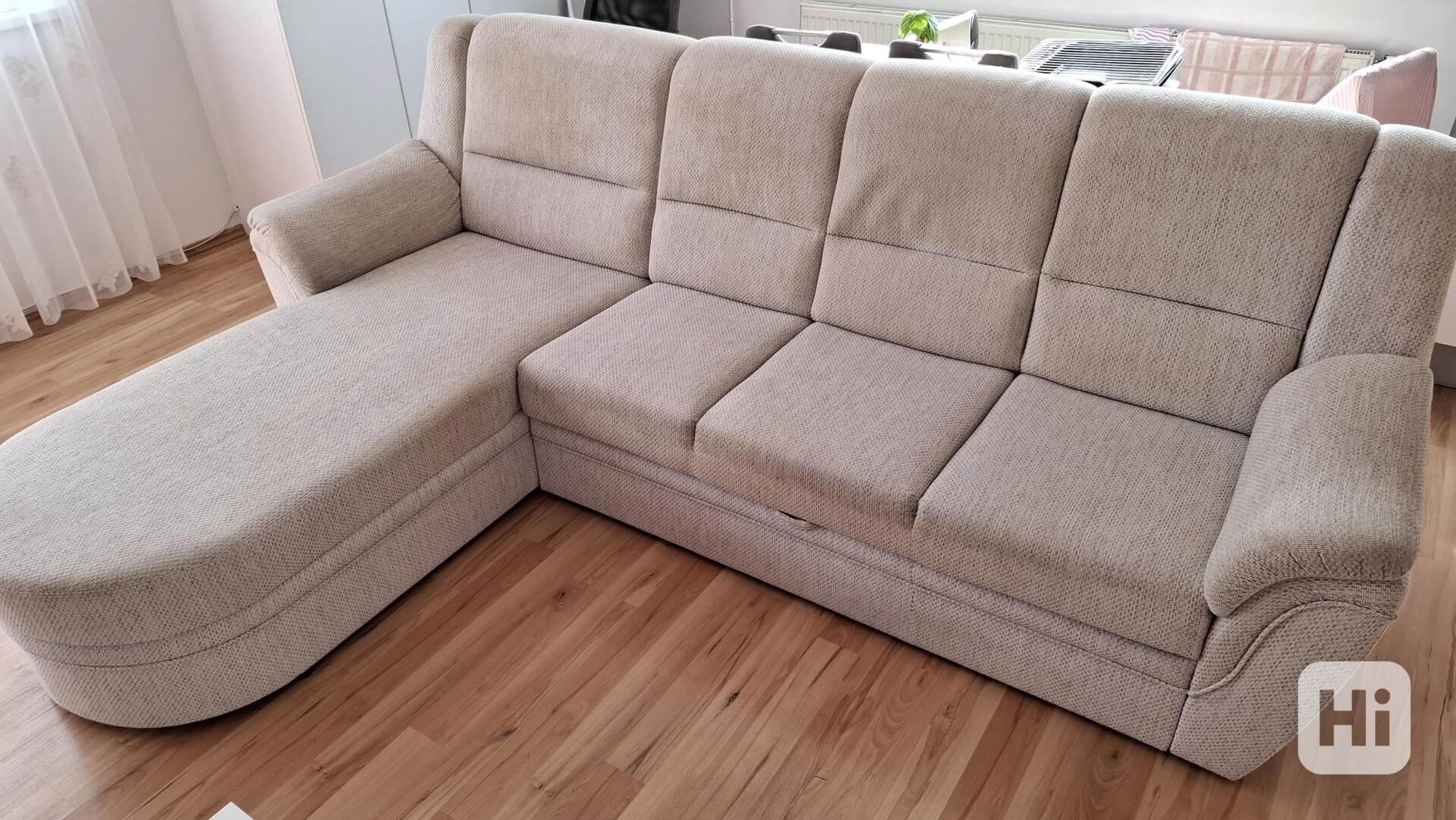 Prodám sedací soupravu s úložným prostorem a lůžkovou úpravou. Barva a rozměry viz obrázky. Pouze osobní odběr dle dohody. Celočalouněná včetně zadní části. Rozložitená na části.