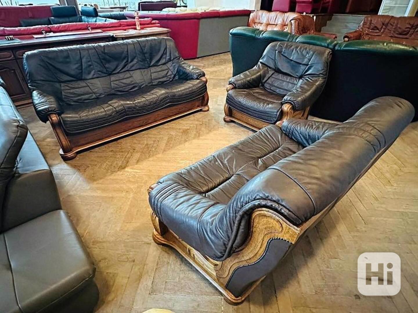 Pravá kůže v kombinaci s ozdobným frézovaným dřevem - tvrdé dřevo - masiv. Vhodná i k umístění do prostoru - vzadu a z boku kůže/látka s ozdobnými čalounickými cvočky (hřeby). Barva tmavě hnědá. Vysoká sedačka. Pravá kůže.