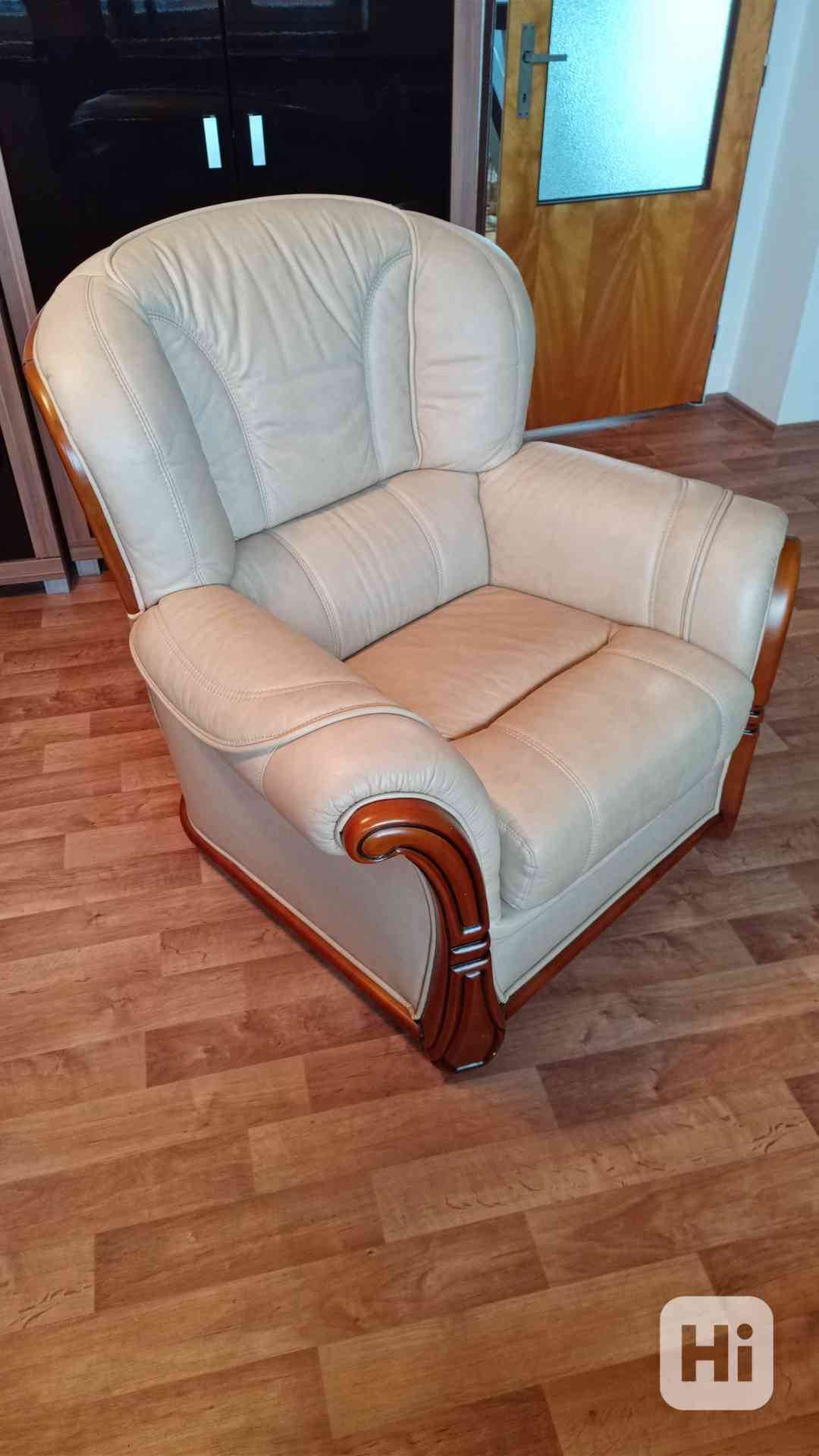 Prodám sedací soupravu sestávající se z křesla, dvousedačky a třísedačky. Před roky kopeno v Asku za 47000,- Sedačky jsou z béžové vepřové kůže s masivními vyřezávanými dřevěnými částmi. Sedačky jsou používané ale velice zachovalé a vyčištěné. Rozhodně lze najít známky používání. Hlavně na nejpoužívanější třísedačce zezadu, kde je podřená od stěny-viz foto. Sedačky jsou těžké díky masivu, ale jde pro transport odšroubovat spodní část od opěradla.