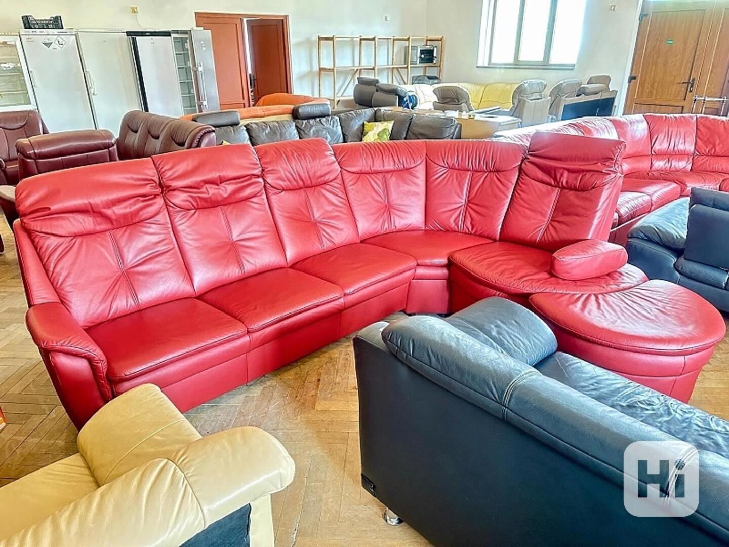Přemístitelný taburet (podnožník). 4x vyklápěcí polohovací opěrka hlavy. Polohovací loketní opěrka. Vysoká sedačka. Pravá kůže.