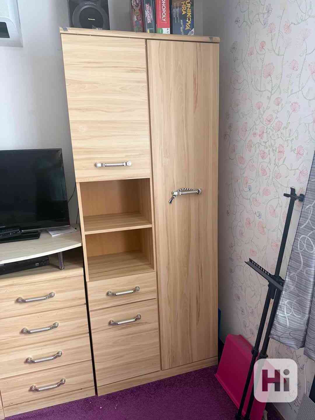 Prodám nábytek z dětského pokoje, místy odřený. Jde o šatní skříň s šuplíky, 2x komoda, 2x policová skříň a policová skříň s šuplíky. Postel s úložným prostorem, rozkládací gauč a počítačový stůl jsou součástí nabídky.