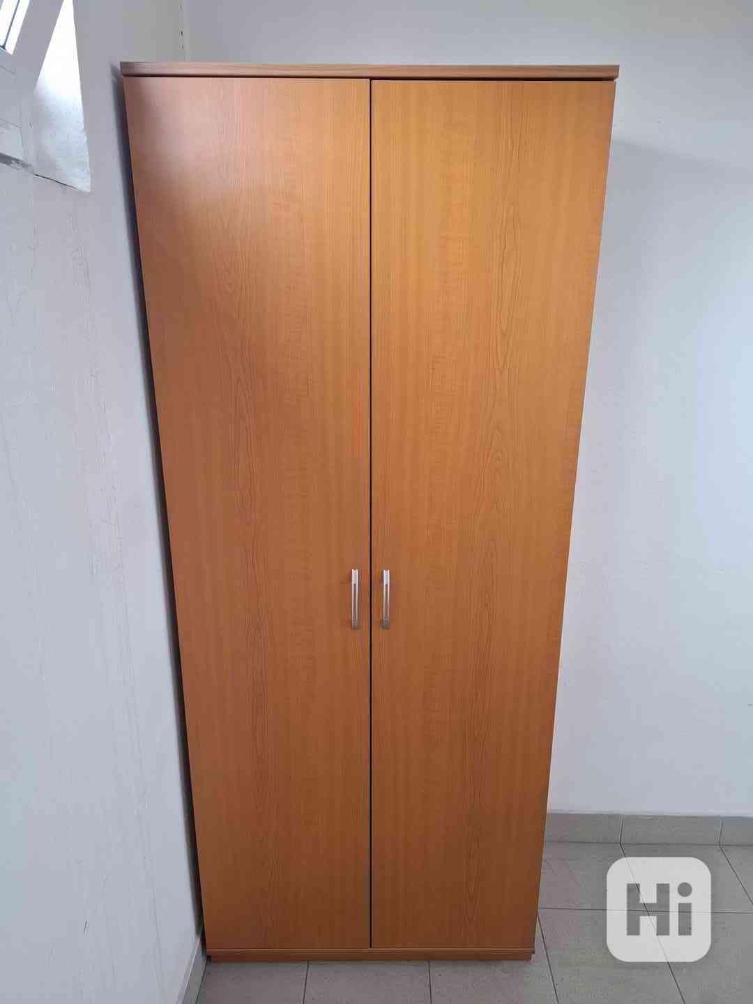 Prodám praktickou dvoudveřovou dřevěnou skříň v dekoru třešeň, která je ve velmi dobrém stavu, čistá a plně funkční – ideální do kanceláře, šatny nebo předsíně. Skříň má konkrétně dvě křídlové dveře s kovovými úchytkami. Uvnitř se nachází pevná horní police, výsuvná závěsná tyč na ramínka a zrcadlo umístěné na vnitřní straně jedněch z dveří. Konstrukce je stabilní, panty funkční, dveře se snadno otevírají i zavírají.