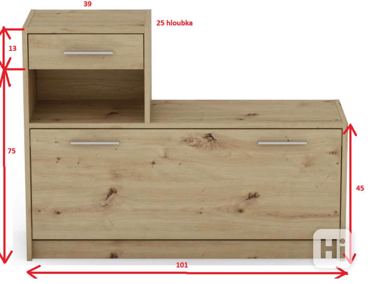 Botníková skříňka: dolní výklopná skříňka (uvnitř přihrádka na boty, až pro 8 párů bot, 1 x šuplík, rozměry viz obrázek.
