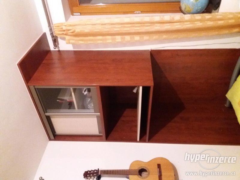 Rohová skříň INDECO,prosklená, zakázková výroba,barva bronz (Calvados)/bříza sněžná. Laminovaná dřevotříska. Skříň samotná(uzavřená část+otevřená polička) 59cm hloubka, 80 cm délka, 101 cm výška. Zadní stěna výška celkem 261 cm, možno zkrátit. Vysoká kvalita, krásný vzhled. PC 8000Kč. Nyní rozmontováno, připraveno k psobnímu odběru.