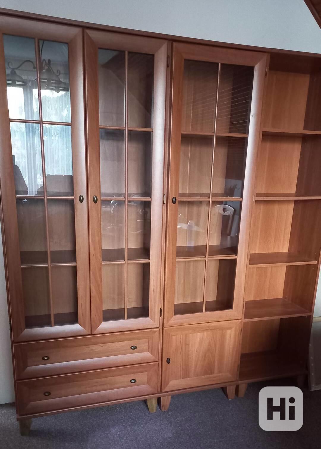 Skříňový set do obýváku nebo jídelny (3 ks). Skříně mohou stát i sólo. Dvoudveřová se dvěma zásuvkami, jednodveřová s dolními plnými dvířky, regál bez dveří. Bez jakéhokoliv poškození.