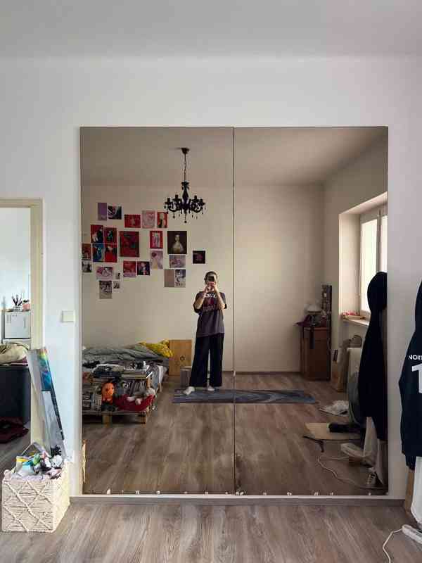 Zrcadla mají v dolní části drobnou vadu a jsou nalepená na OSB desce s otvory pro zavěšení