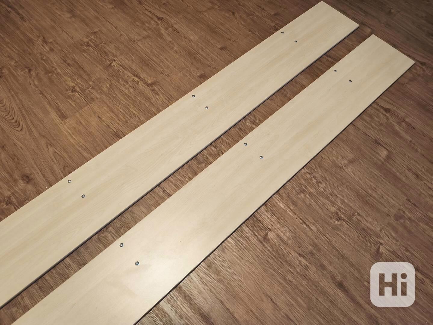 Prodám dvě laminované dřevotřískové desky v dekoru javor, rozměry 2500 x 250 x 16 mm. Všechny boční strany cháněné ABS hranou, jedna dlouhá boční strana ostrá, druhá oblá. Desky jsou v perfektním stavu, sloužily jako police v dětském pokoji. Cena 400 Kč/kus. V případě zájmu můžu k deskám dodat za 200 Kč i nástěnné lišty délky 1 m a podpěry pod police - viz. foto.