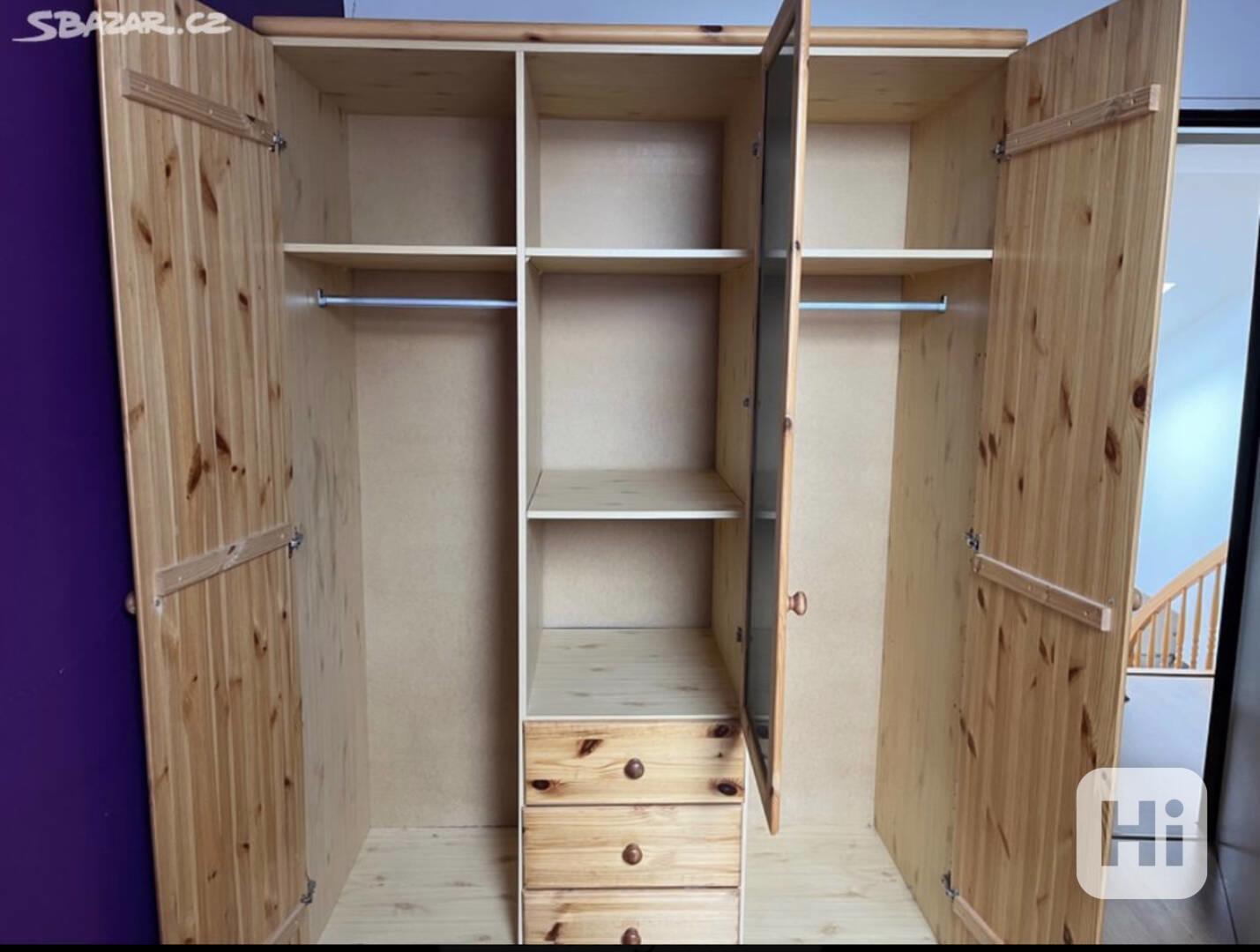 Šatní skříň z borovice V-200, Š-145, H-60. Vlastní odvoz. Skříň je v rozloženém stavu, pripravena k odvozu.