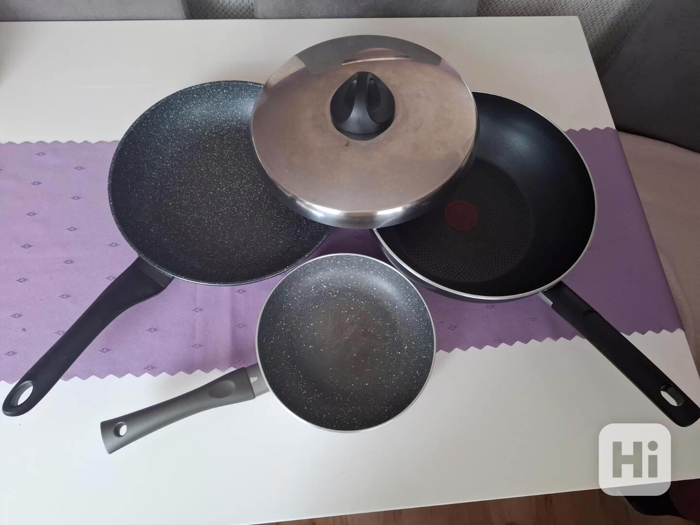 Prodám sadu pánví, 3 kusy: Velká pánev Wok s poklicí (zn. Tefal) - 28cm, nízká pánev - 28cm, malá pánev - 20 cm. Všechny použité ale nepoškozené, nepoškrábané. Nepřilnavé povrchy. Vhodné na všechny typy ohřevů včetně indukce. Pouze osobní odběr v Praze!
