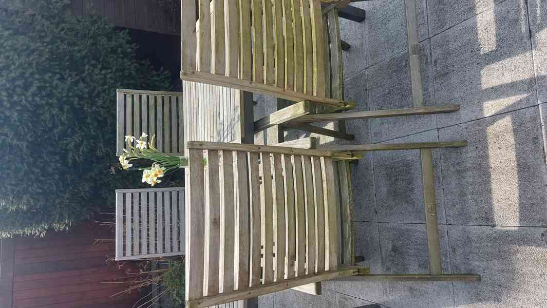 Prodám zahradní nábytek z masivu. Roztahovací stůl a 2x polohovací křeslo. Rozměry stolu 170 - 230/ 90 cm. Jedno křeslo mírně poškozené - uhnilé špalíky na opěradle, oprava snadná. Velmi stabilní sestava.